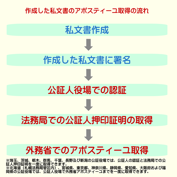 委任状や法人代表者証明は官公所で発行される公文書ではなく、私文書に当たりますので外務省では直接アポスティーユはできません。事前に公証役場での認証が必要になります。認証を受ける書類には署名又は記名押印が必要です。他者が作成した書類の場合は宣言書に署名又は記名押印することになります。具体的には宣言書、証明書原本、証明書の翻訳文を綴り合わせたものを一対として公証役場で認証を受けることになります。