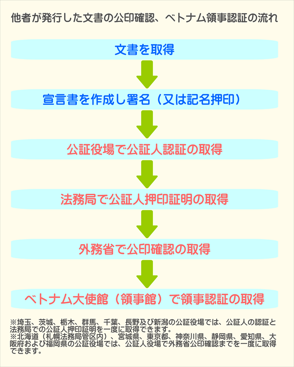 - 翻訳文の領事認証:公証役場認証→外務省公印確認→領事認証