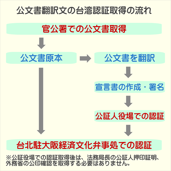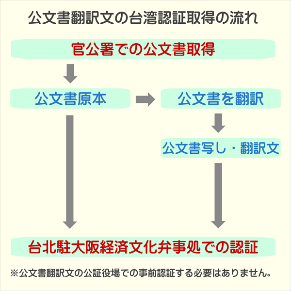 また、台北駐大阪経済文化弁事処では原本と一緒に認証する場合は、公証役場での認証を受けずに直接認証をしてくれます。事前に公証役場での認証は不要ですが、原本と翻訳文書のい2部を認証することになるのは同じです。