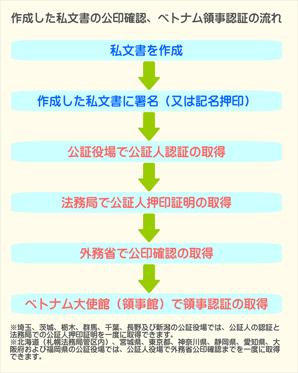 私文書の公証人公証、外務省公印確認、ベトナム領事認証手続き代行の流れ
