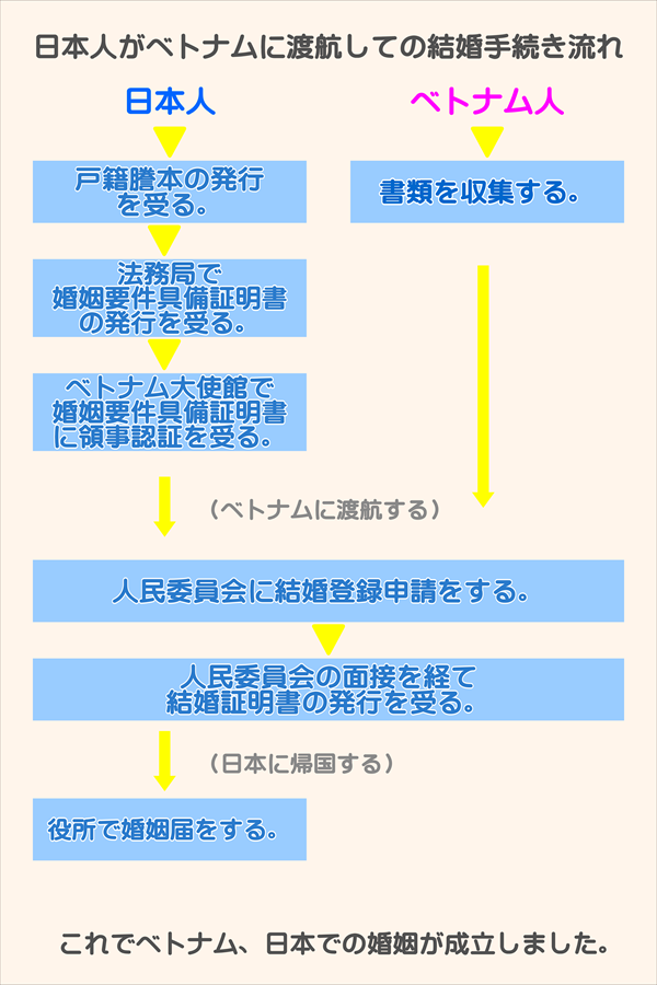 ベトナム人技能実習生のDさんと職場で知り合った、日本人Tさんは交際を深め結婚を誓い合いました。実習プログラムを終えたDさんはベトナムに帰国しましたので、Tさんはベトナムでの結婚手続きのための準備を開始しました。法務局を訪れ自身の戸籍謄本とDさんのパスポートコピーを提出し、婚姻要件具備証明書の発行を受けました。次に外務省を訪れ婚姻要件具備証明書に公印確認を受けました。その後、在日本ベトナム総領事館を訪れ罪人、婚姻要件具備証明書の翻訳認証を受けました。そして、ベトナムを訪れたTさんはDさんとともに人民委員会に出向き婚姻登録をすませ、結婚証明書の発行を受けました。